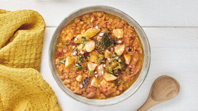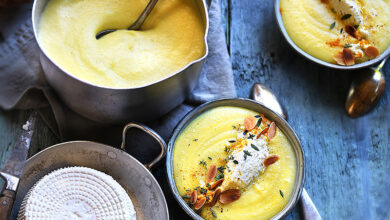 Velouté de pois chiches, curcuma, croûtons de graines de tournesol et Jambon de Parme