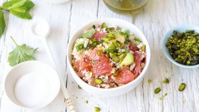 Taboulé de chou-fleur au pamplemousse, avocat, coriandre, menthe, pistaches