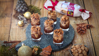 Verrines en 3 couches : foie gras, crumble de pain d’épices et chutney de mangue