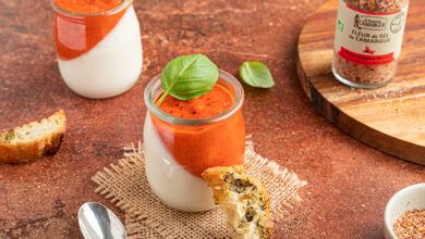 Panna cotta au chèvre, coulis de poivron et croûtons