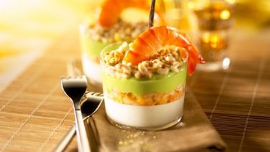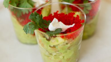 Verrines d’avocat et pamplemousse à la menthe et Tobikos aux épices Sturia