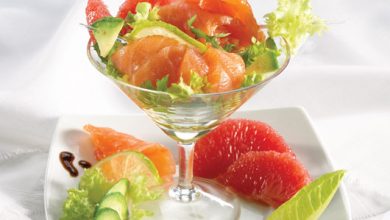 Cocktail de saumon de Norvège fumé servi avec pamplemousse rose et avocat