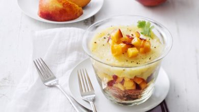 Verrine d’effiloché de canard aux Nectarines de nos Régions et purée de pommes de terre et panais