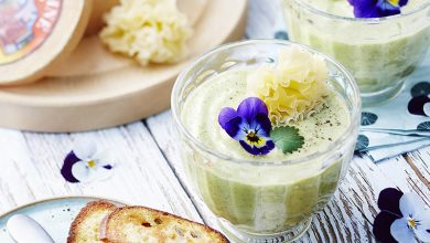 Gaspacho vert au concombre, courgette, basilic, Tête de Moine AOP et fleurs de pensée