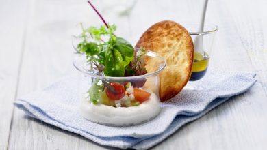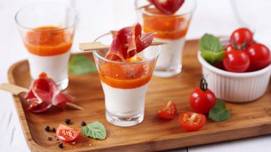 Verrine de brebis à la menthe, gaspacho et brochette de jambon cru