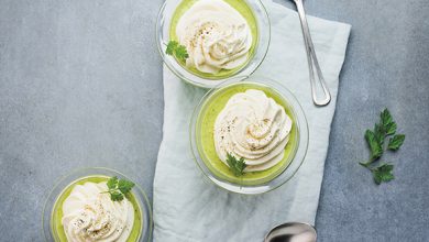 Gaspacho de melon au St Môret® Ligne & Plaisir®, jambon de Parme croustillant