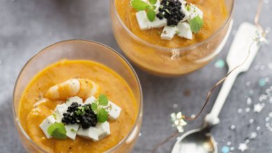 Velouté de langoustines, cubes de Caprice des Anges et œufs de harengs fumés