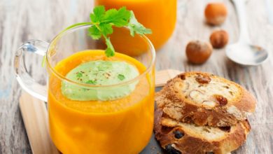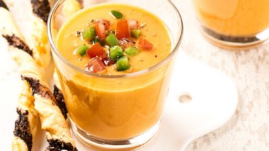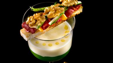 Gaspacho de pommes de terre émulsionné à l’huile de noix, Crostini de Noix du Périgord et magret fumé