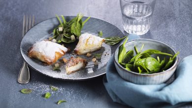 Pastilla au Carré Frais®, poire, épinards crus en salade