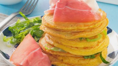 Pancakes aux herbes, sauce yaourt et Jambon de Parme