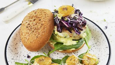 Burger de poulet, sauce banane curry, bananes rôties et pousses d’épinard