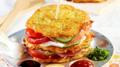 Burger au boudin noir, aux galettes de pommes de terre et aux pommes