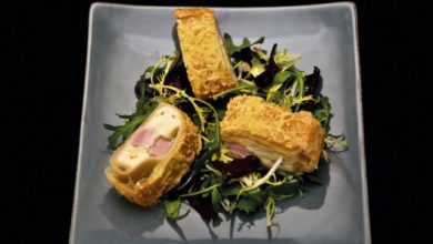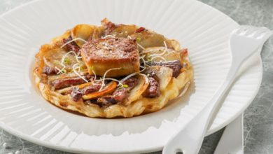 Tatin de canard aux pommes de terre, confit d’échalotes et foie gras poêlé