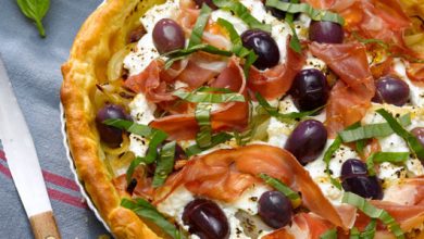 Torta d’olives violettes, chèvre frais et jambon Serrano