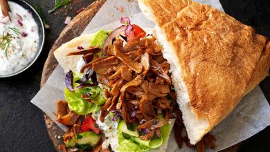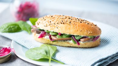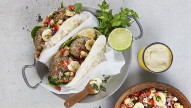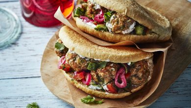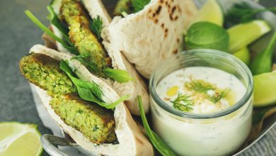 Sandwich aux falafels de quinoa et lentilles aux épinards, sauce au yaourt