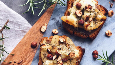 Tartines de pain d’épices, poires, Rocamadour et noisettes grillées