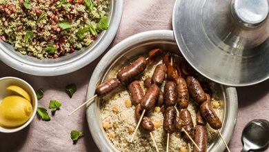 Semoules végétales de mie de pain au froment et graines de grenade, brochettes de merguez, harissa à la framboise