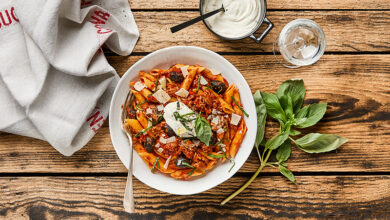 Penne au ragù d’épaule d’agneau à la tomate et aux olives noires