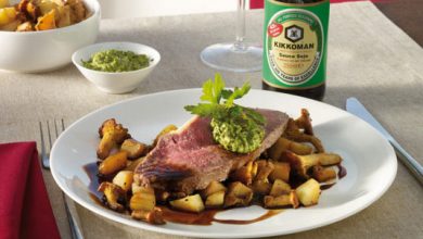 Rôti de Bœuf garni de pommes de terre et champignons au pesto, sauce soja Kikkoman