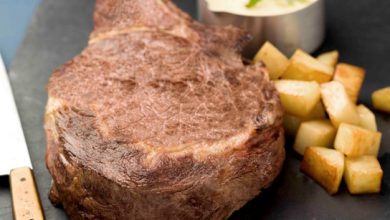 Côte de bœuf grillée à la fleur de sel, champignons de Paris et petites rattes grillées au persil et à l’ail, vinaigrette à la noisette