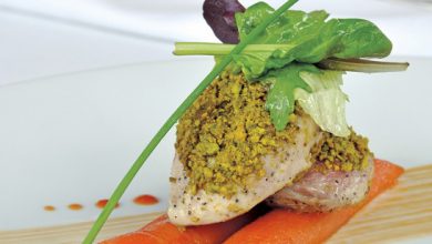 Carottes des sables glacées à l’orange, poitrine de caille rôtie et fruits secs
