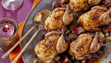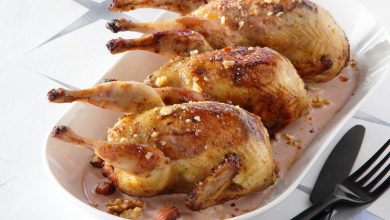 Cailles fermière Label Rouge farcies aux noix et aux noisettes, crème au Porto et aux échalotes