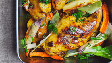 Lapin rôti et légumes de saison rôtis aux épices colombo