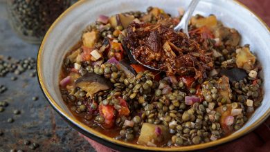 Cocotte de lentilles vertes aux aubergines et pulled pork