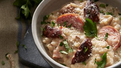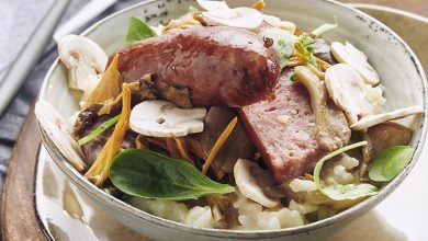 Risotto crémeux au Brillat-Savarin, poêlée de champignons et Saucisse de Montbéliard