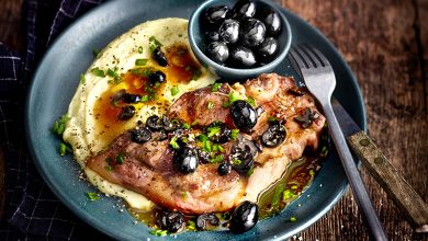 Côte de porc fermier au jus d’olive noire Hojiblanca, écrasé de pommes de terre minute