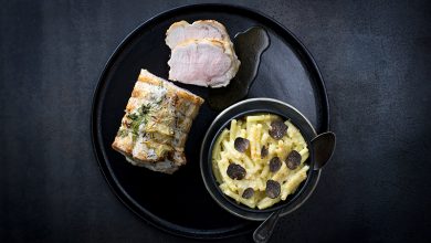 Rôti de porc au beurre truffé, macaronis aux truffes