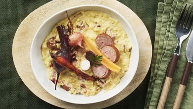 Mini-légumes glacés au cassis de Bourgogne, polenta crémeuse et Saucisse de Montbéliard