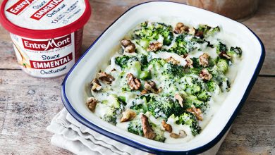 Gratin de brocolis, noix et sauce Emmental Entremont