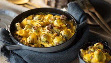 Gratin savoureux de tortellini, saucisses & romarin et sauce béchamel au potiron