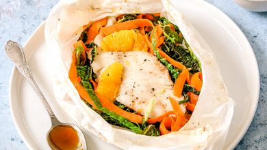 Papillotes de tacaud, chou, carottes, sauce à l’orange