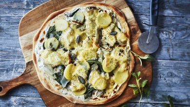Pizza aux pommes de terre, blettes, raclette fumée et crème au bleu