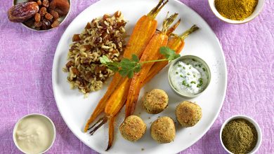Céréales aux fruits secs, carottes rôties au cumin et falafels sauce tahin