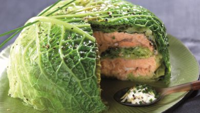 Millefeuille de chou vert et saumon, sauce crème et ciboulette