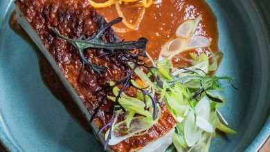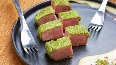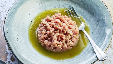 Tartare de veau à la crème de thon, eau de tomates Green Zebra parfumée à l’huile d’olive