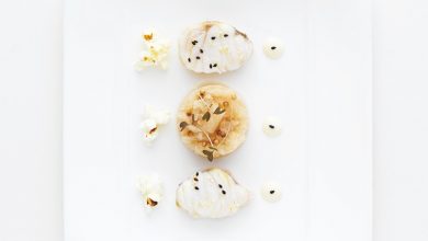 Écrasés de salsifis, médaillons de lotte et pop-corn