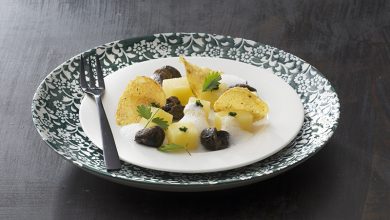 Fricassée d’escargots, pomme de terre Pompadour, crème de persil et jus d’ail mousseux
