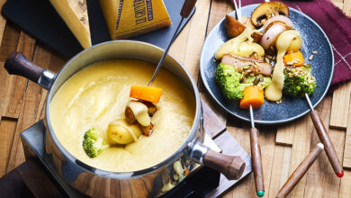 Fondue moitié-moitié et ses brochettes de légumes aux graines