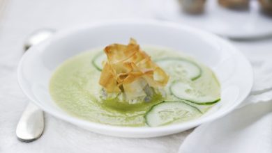 Soupe de concombre au beurre d’ail et aumônières d’escargots