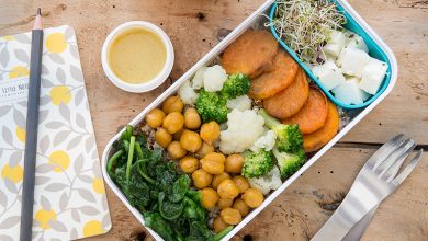 Lunch box choux-fleurs et brocolis, pois chiche rôtis, quinoa, feta et patate douce