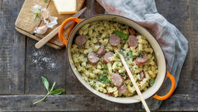 One pot pasta au beurre Charentes-Poitou AOP, saucisse fumée, ail, basilic et parmesan