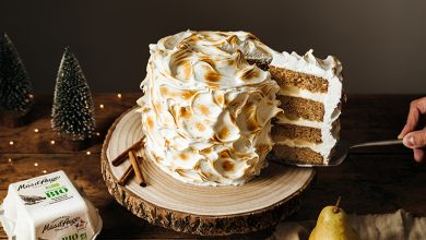 Gâteau de Noël aux épices et poires, surmonté de sa meringue flambée