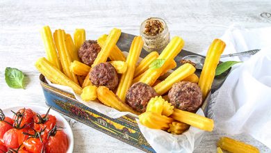 Mini-Churros de pommes de terre Croustibat, boulettes de bœuf haché et tomates cerises rôties au basilic