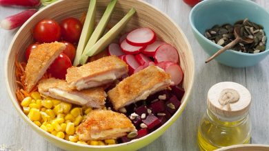 Poke bowl aux crudités et Cordon Bleu au Comté et bacon