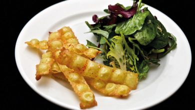 Tagliatelles au pesto, tuiles de parmesan et gousses d’ail confites