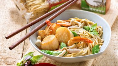 Nouilles sautées aux crevettes et Saint-Jacques, curry et lait de coco